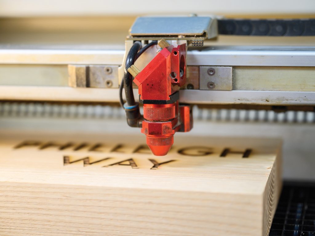 — Flame Polishing & Engraved Effects on Wood – The laser creates beautiful effects on wood materials. It can create engraved textures, and affects the grain in really interesting ways, bringing out depth and character that adds a whole extra dimension to timber pieces. We can even open up the back of the machine to feed things through larger pieces.