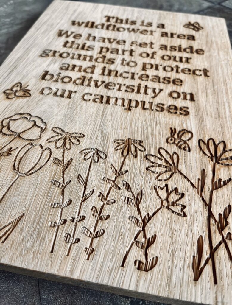 — FXPlus biodiversity panels communicating that wildflower areas on campus have been set aside to protect and increase biodiversity.